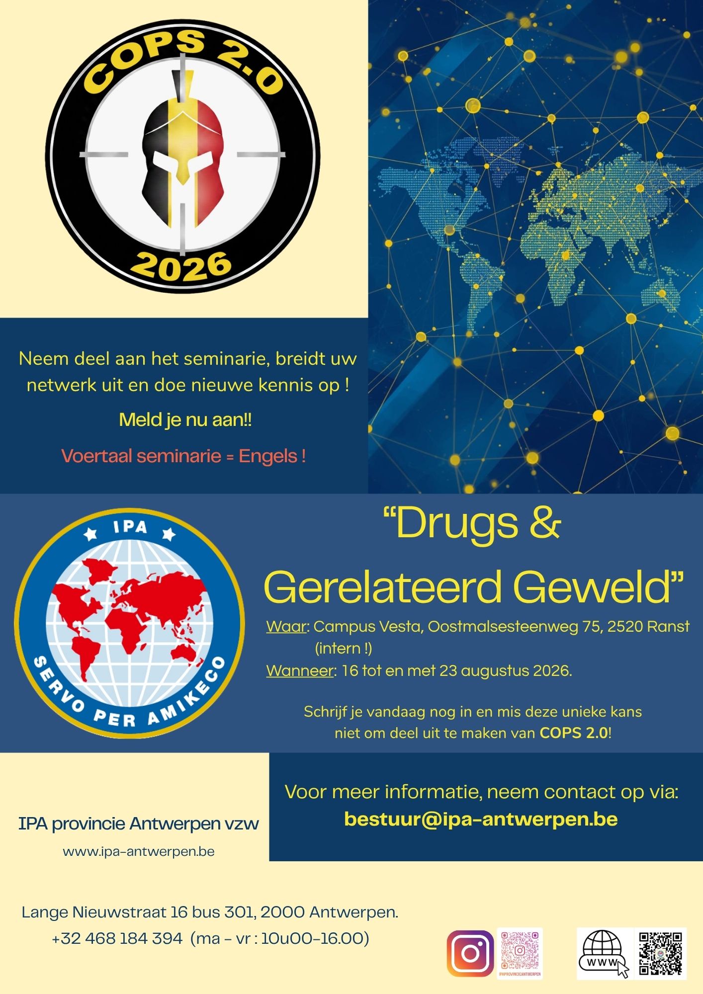 Ben jij klaar om je tactische en forensische vaardigheden naar een hoger niveau te tillen? IPA Antwerpen presenteert met trots de nieuwste editie van het Cops 2.0 seminarie. Van 16 tot en met 23 augustus 2026 transformeren we Campus Vesta tot het zenuwcentrum van kennisdeling, actie en internationale politiesamenwerking.